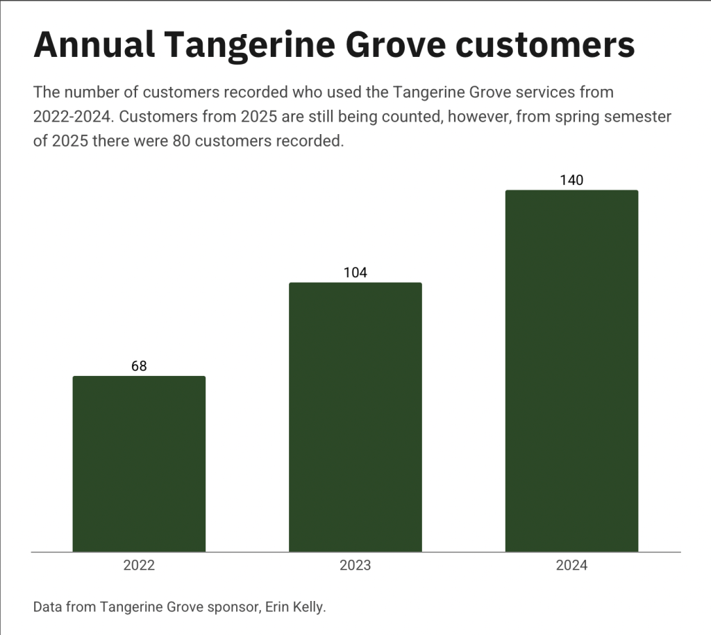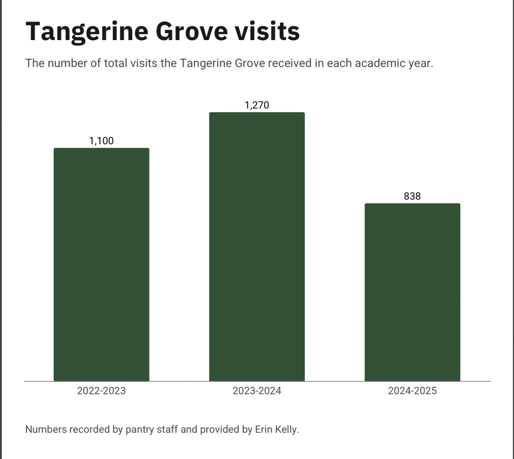 In the 2023-2024 academic year, the Tangerine Grove peaked in foot traffic throughout the year with 1,270 visits recorded. This is 170 more visits than the prior academic year. Then after the 23-24 academic year there was a large drop off in visits and the number of customers. Throughout the years, Kelly has noticed a trend of more foot traffic in the pantry at the end of semesters, when students are gearing up to go home and students can not afford to buy bulks of food that they won’t go through.